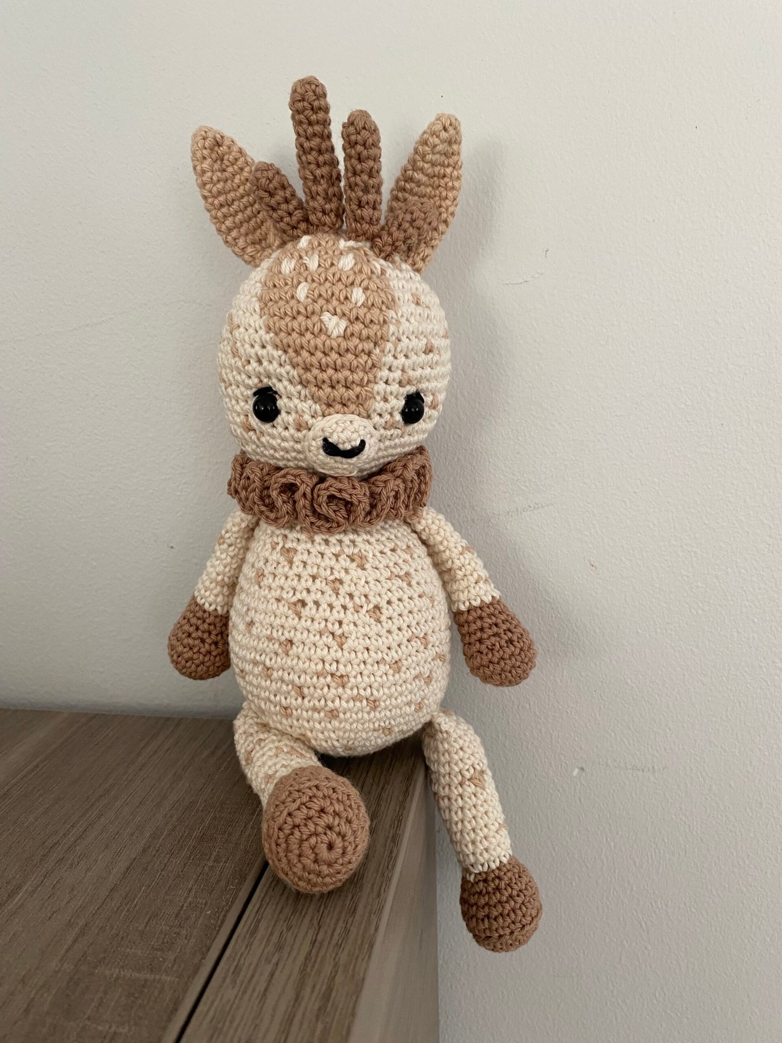 Le travail artisanal permet de créer une peluche crochet faon au style intemporel, loin des jouets standardisés. Chaque détail est pensé pour obtenir un résultat harmonieux, doux et esthétique.