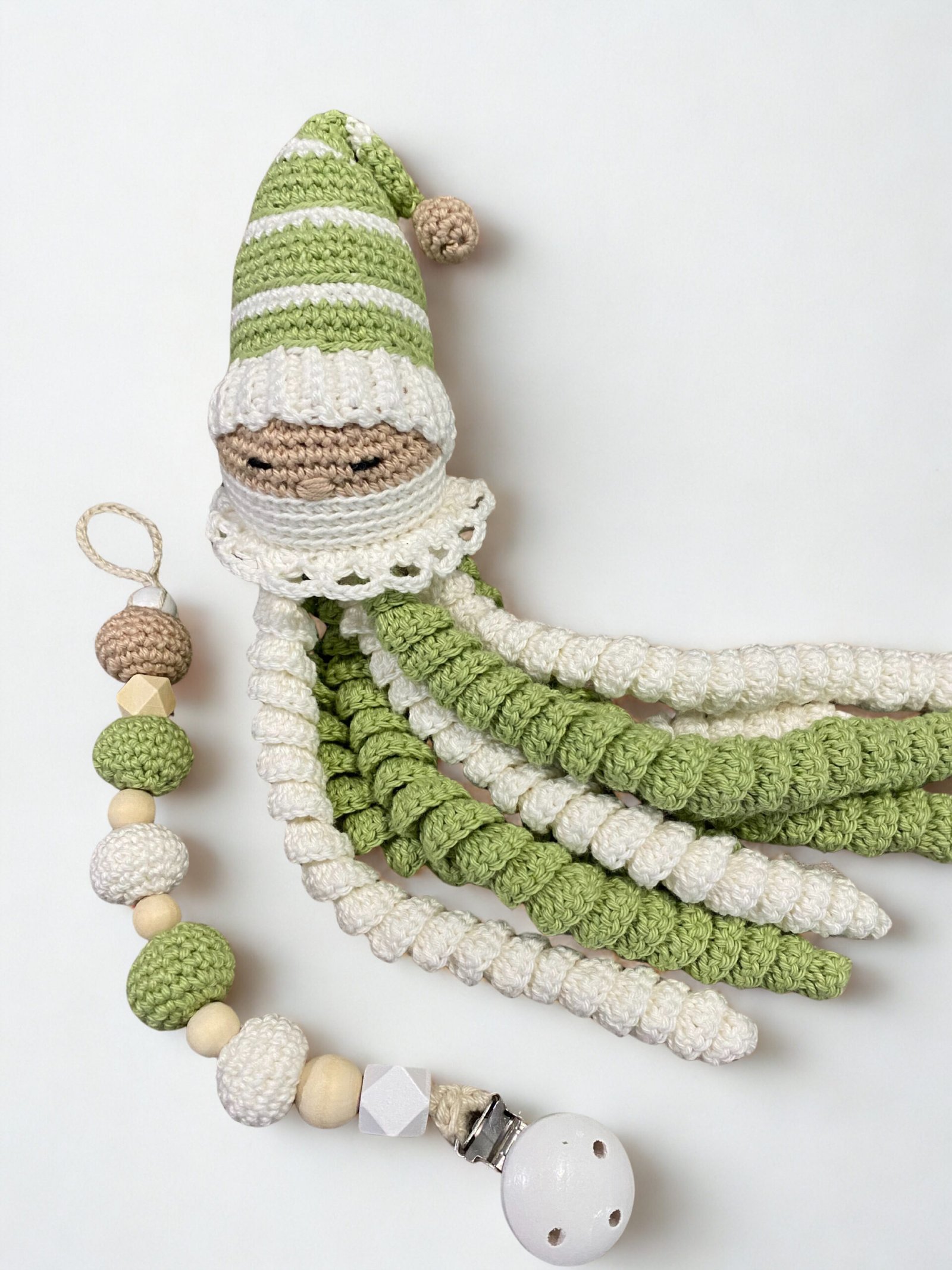 Ce doudou crochet poulpe personnalisé est une création artisanale pensée pour accompagner bébé dès ses premiers instants. Entièrement confectionné à la main, ce doudou crochet allie douceur, esthétisme et authenticité dans un design inspiré de la nature. Ses tons blanc et vert délicats s’intègrent parfaitement dans une chambre bébé aux couleurs naturelles et apaisantes.